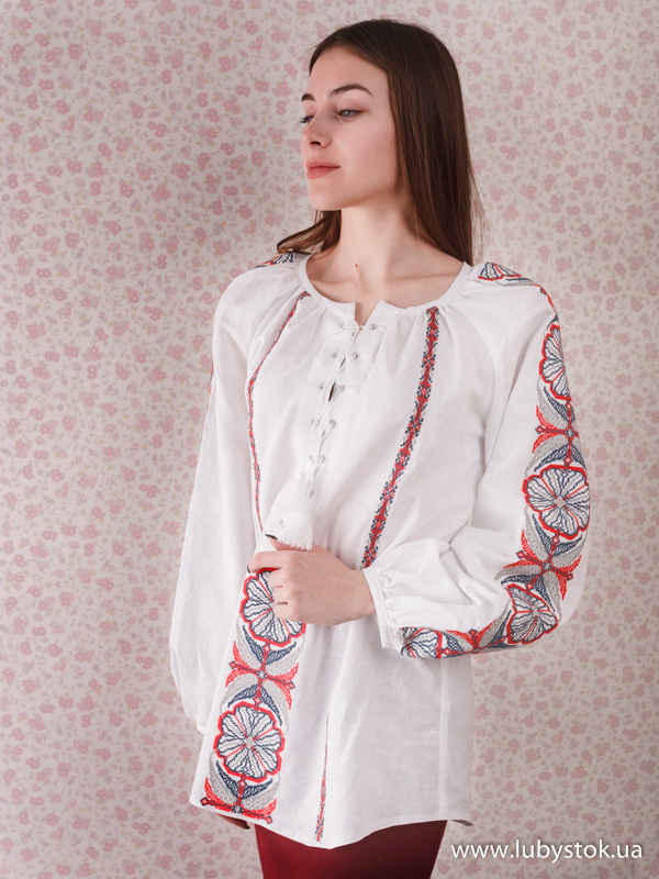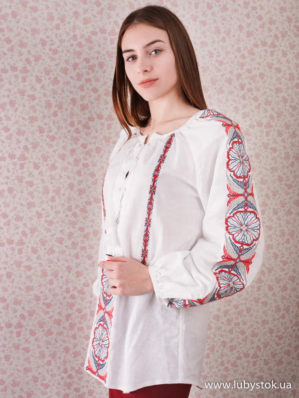 Вишиванка хрестиком - вишита жіноча сорочка ЖБВ 76-1. Завдяки роскішному орнаменту має багатий вигляд. Стиль сорочки сучасний на білому натуральному льоні. Вишиванка вишита хрестиком червоними, сірими та темно-синіми акриловими нитками. Вишивка виконана рослинно-геометричним візерунком, розміщена на грудях та рукавах вишиванки. Рукав довгий. Ця сорочка підійде для урочистих подій та національних свят. Надасть вам особливого вигляду.