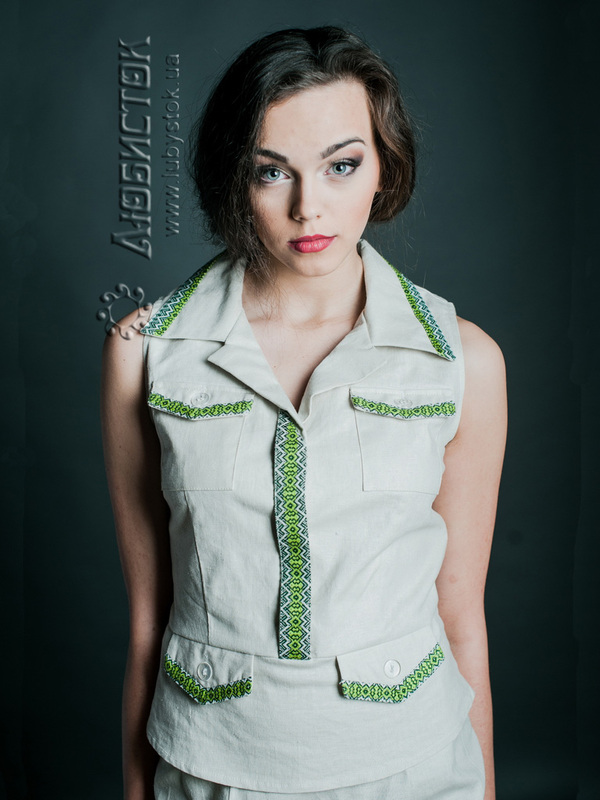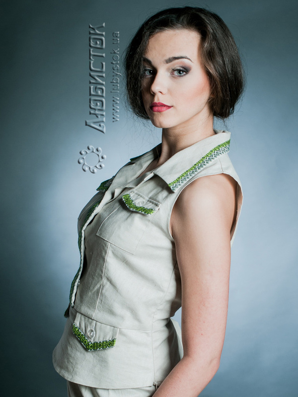 Нестандартний фасон модної вишитої жіночої блузи ЖБ 109-31. Крій схожий до жакету без рукавів. Дуже елегантно виглядає, завдяки на національну стилістиці. Чудовий варіант для літнього гардеробу. Виготовлена блуза з легкої тканини природного бежевого відтінку. Оздоблена вишивкою в зелених тонах на відкидному комірці, а також накладних кишеньках. Одягнувши таку вишиванку ви однозначно виділятиметесь і ловитимете на собі зацікавлені погляди оточуючих. Будьте чарівною завжди!