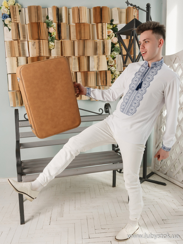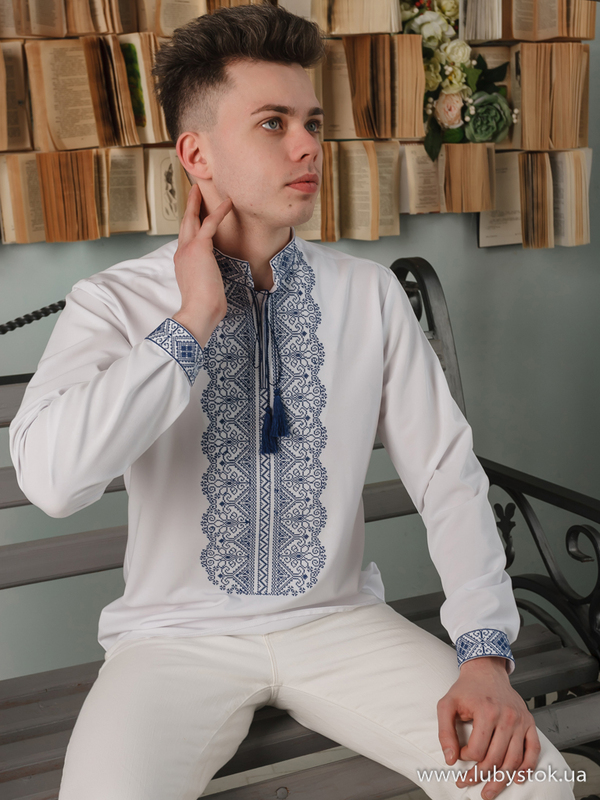 Вишиванка хрестиком - чоловіча вишита сорочка з синьою вишивкою приталена на кокетку S-073-01..