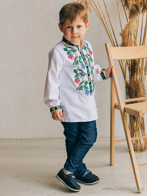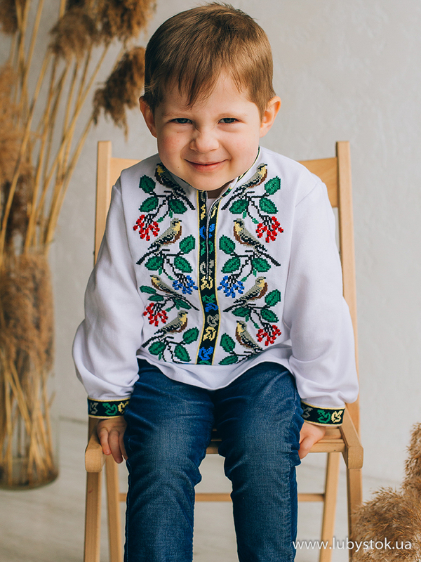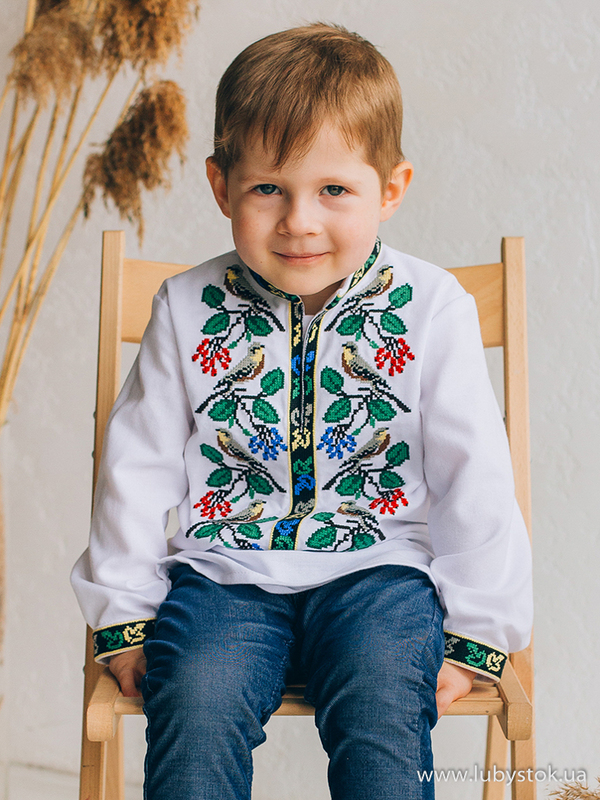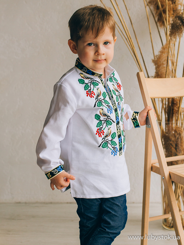 Вишита сорочка дитяча - вишиванка для хлопчика хрестиком S-121-01-d на білому домотканому полотні з оригінальним рослинно-тваринним візерунком: пташки та гілля рослин. Традиційний крій сорочки на довгий рукав з коміром-стійкою. Вишивка на грудях, манжетах рукавів, комірі-стійці.
