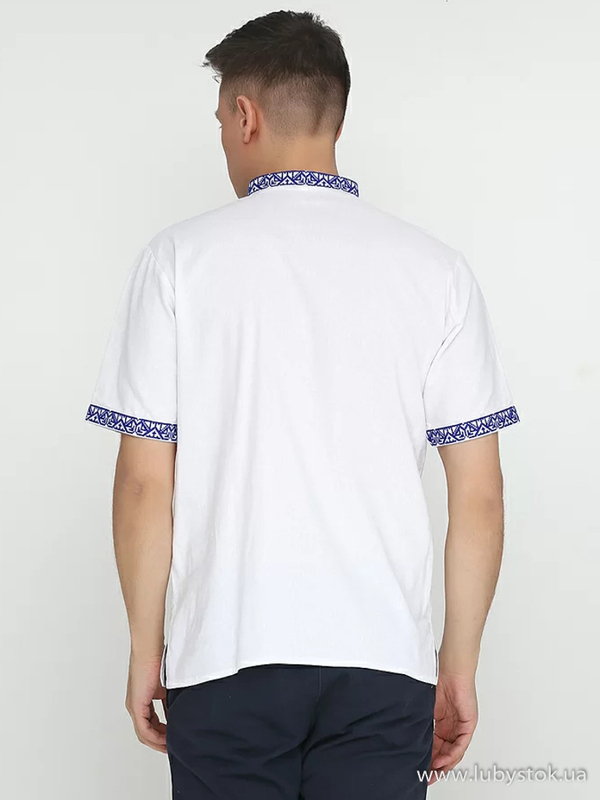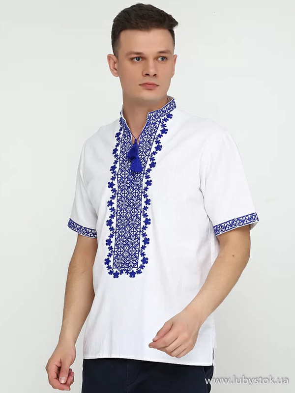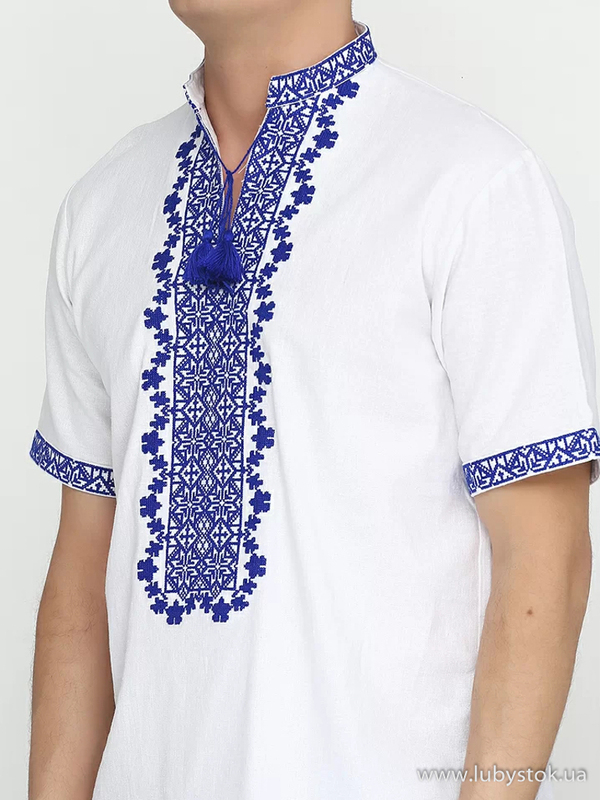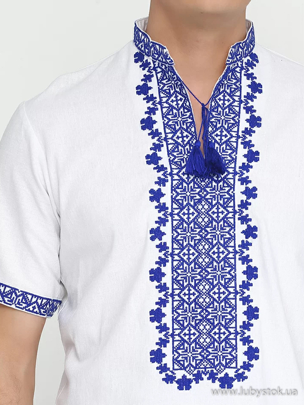 Вишита сорочка чоловіча - вишиванка хрестиком С 127-2. Завдяки візерунку та фасону має особливий вигляд. Традиційний український крій сорочки з білої тканини натурального льону. Вишиванка виконана хрестиком синіми акриловими нитками, геометричним візерунком. На довгий рукав з коміром-стійкою. Вишивка на грудях, манжетак та комірі-стійці. Чудово підійде як для святкових так і для днів коли хочеться мати особливий вигляд.