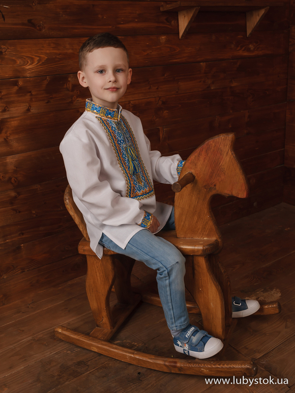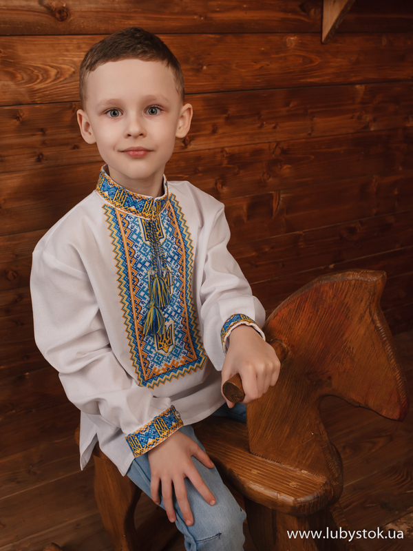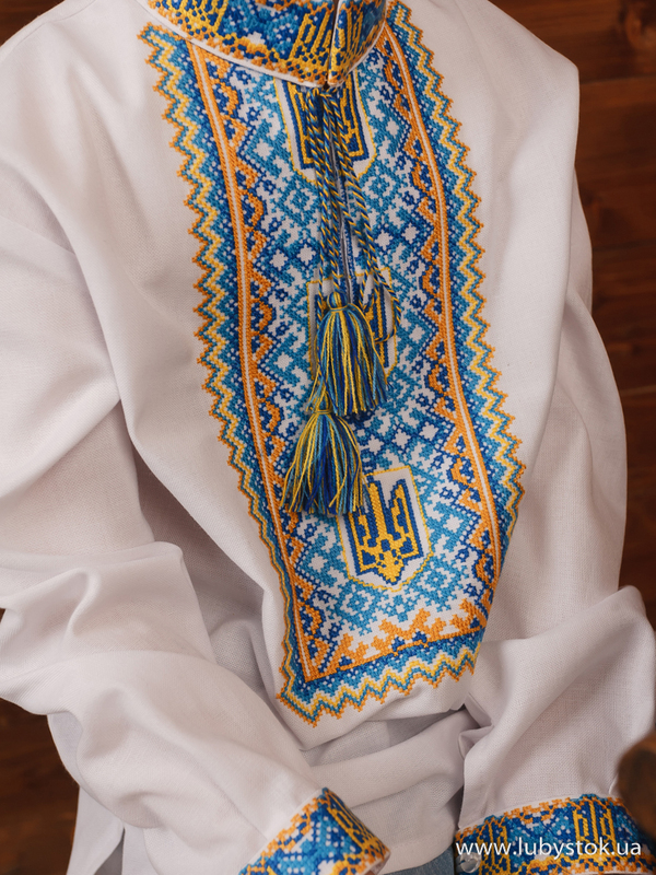 Вишита сорочка чоловіча - вишиванка хрестиком з тризубом дитяча ЧСВ 45-1Д на домотканній тканині з жовто-блакитним візерунком у традиційному стилі.