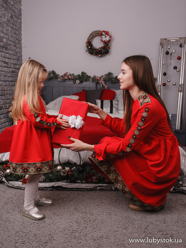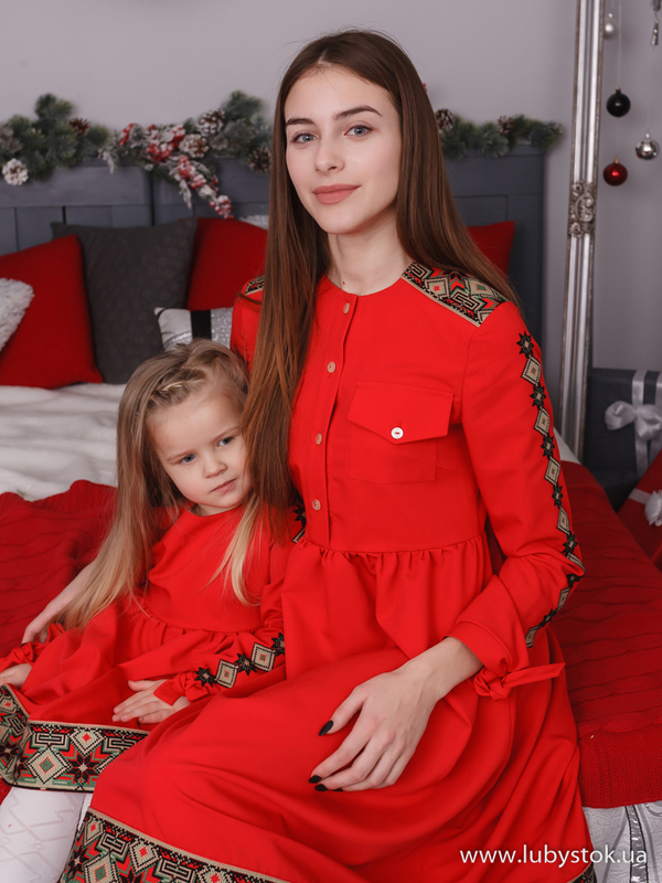 Комплект сімейних вишиванок в одному стилі F-006: вишите плаття для мами D-111-01 та вишита сукня для дочки D-111-01-d.
