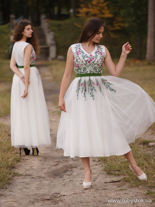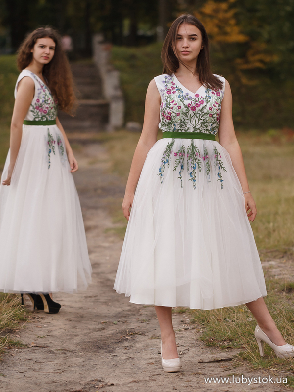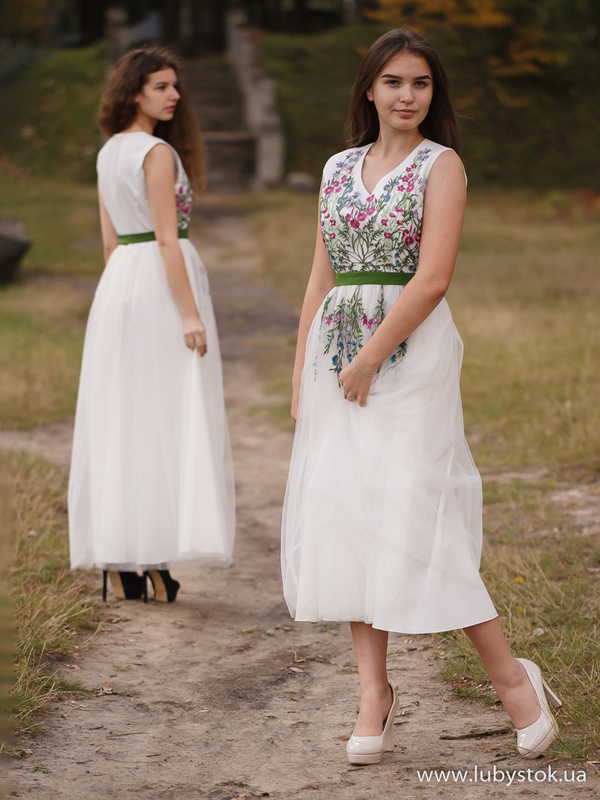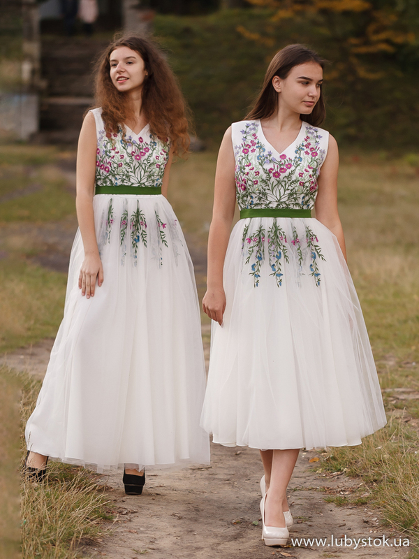 Комплект сімейних вишиванок в одному стилі F-007: вишите плаття для сестри D-092-01 та вишита сукня для сестри D-092-01.