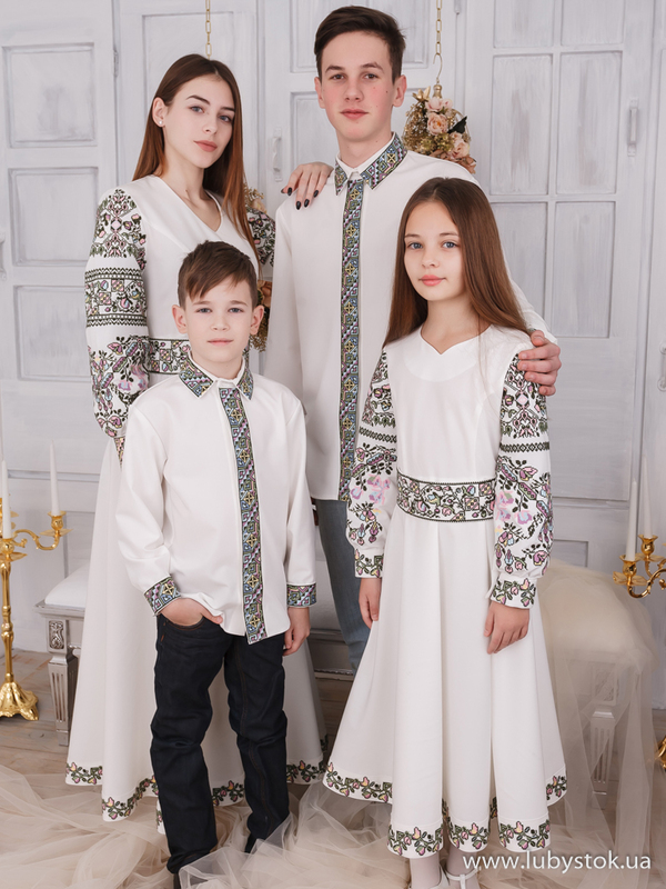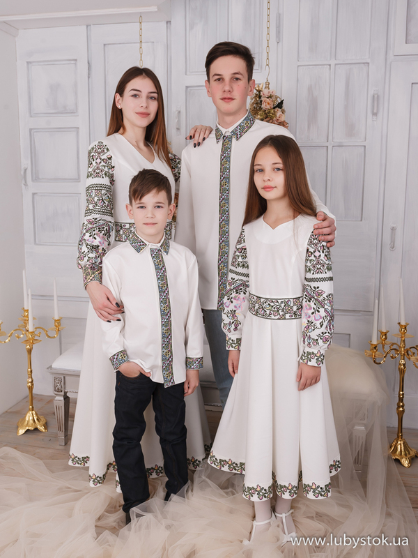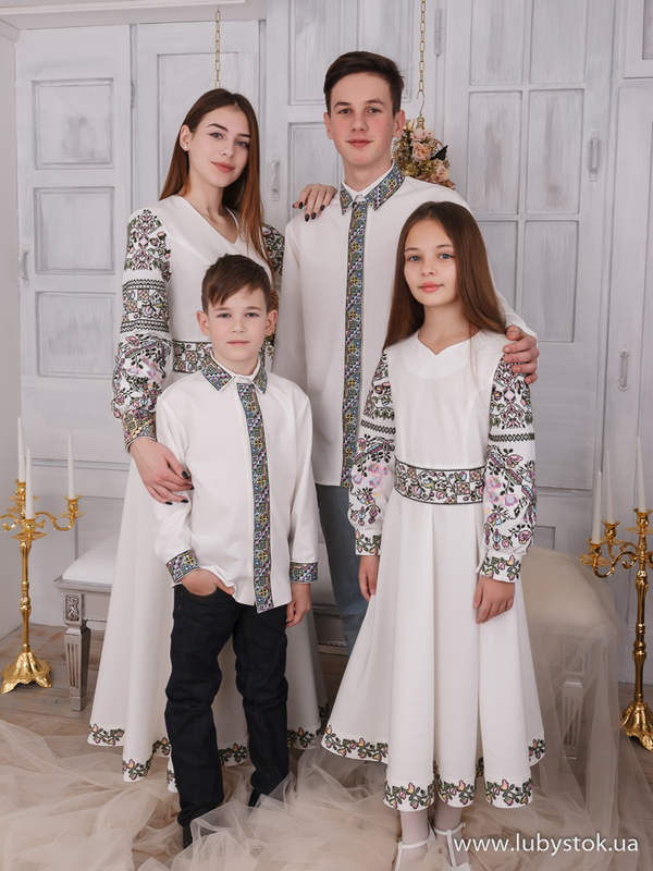 Комплект сімейних вишиванок в одному стилі F-011: вишиванка для тата S-117-01, вишите плаття для мами D-109-01, вишите плаття для дочки D-109-01-d та вишиванка для сина S-117-01-d.