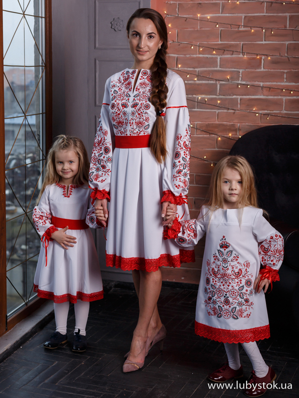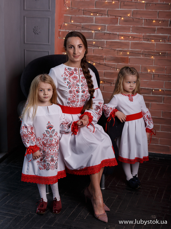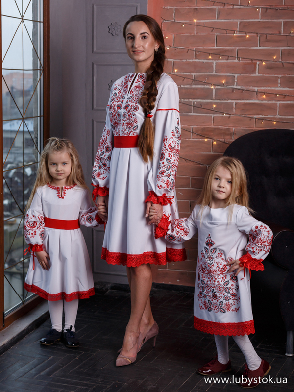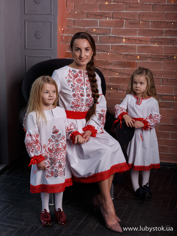Комплект сімейних вишиванок в одному стилі F-012: вишите плаття для мами D-100-01, вишита сукня для одної дочки D-104-01-d та другої дочки D-128-01-d.