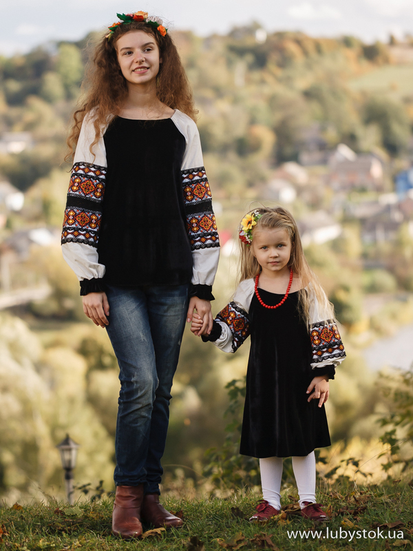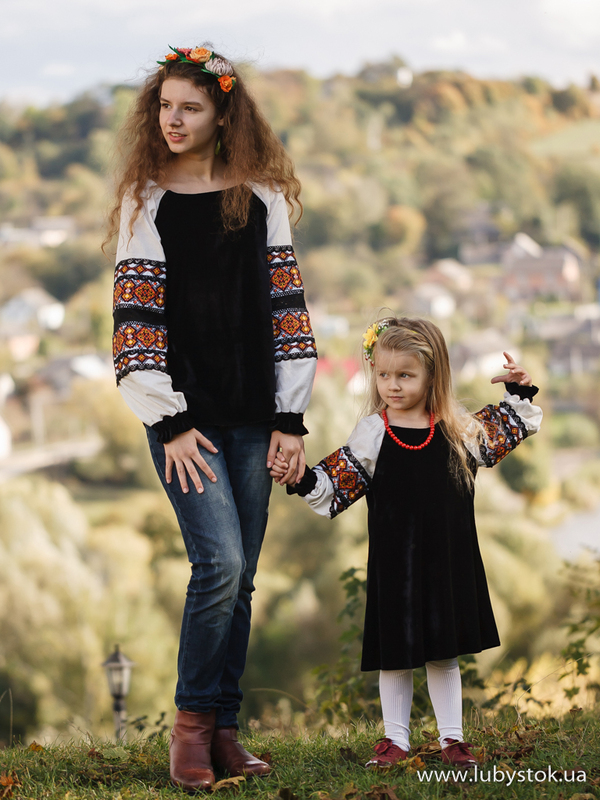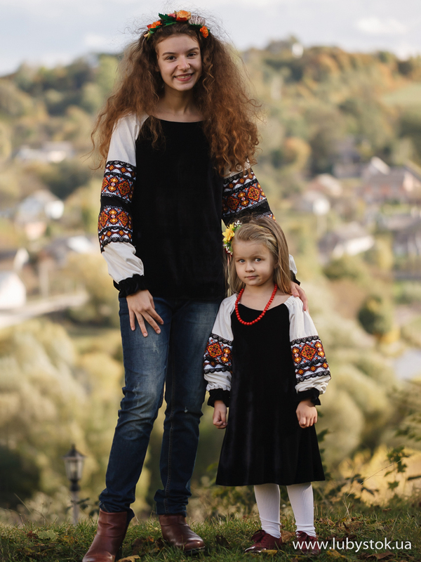 Комплект сімейних вишиванок в одному стилі F-018: вишиванка для мами B-050-01 та вишита сукня для дочки D-095-01-d.