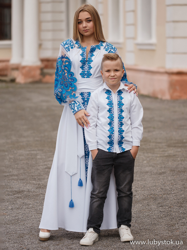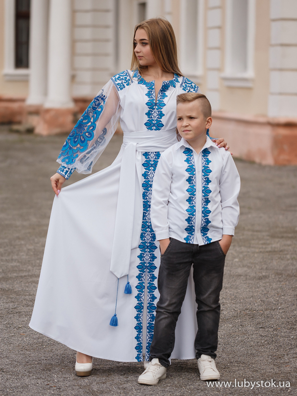 Комплект сімейних вишиванок в одному стилі F-021:вишите плаття для мами D-082-01 та вишиванка для сина S-086-01-d.