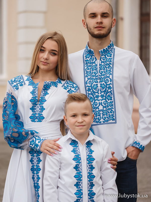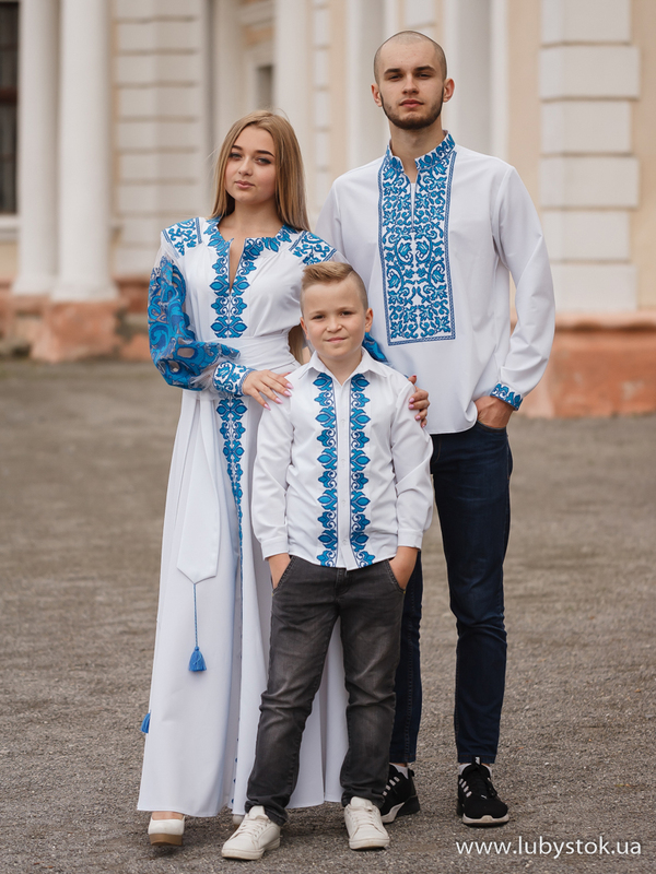 Комплект сімейних вишиванок в одному стилі F-022: вишиванка для тата S-076-01, вишите плаття для мами D-082-01 та вишиванка для сина S-086-01-d.
