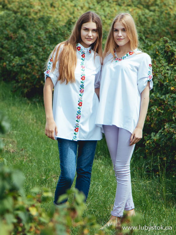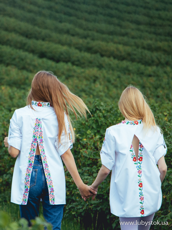Комплект сімейних вишиванок в одному стилі F-027: вишиванка для сестри B-041-01 та вишиванка для сестри B-044-01.