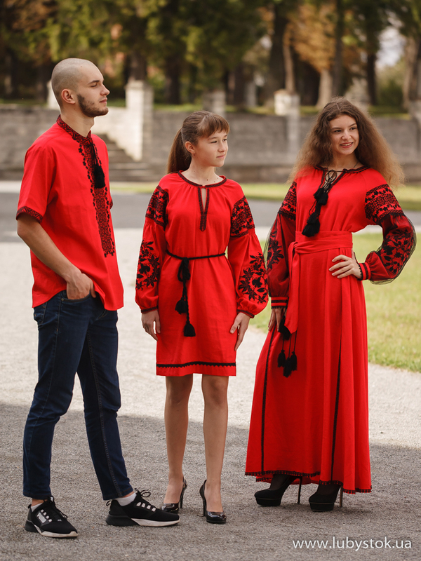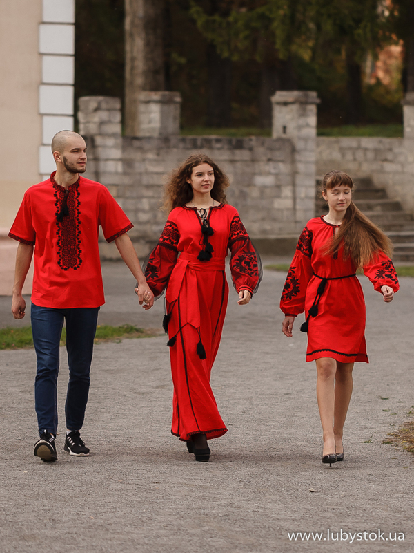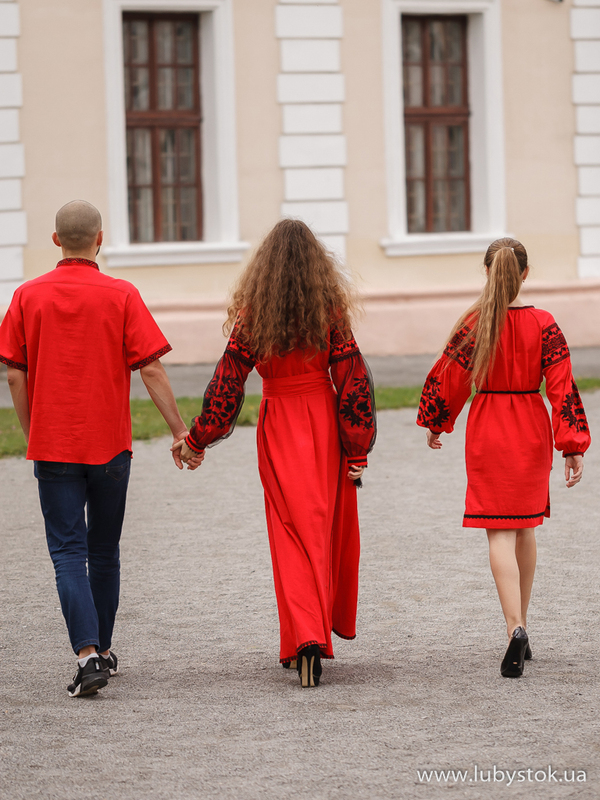 Комплект сімейних вишиванок в одному стилі F-029: вишиванка для тата S-127-01, вишите плаття для мами D-081-01 та вишита сукня для дочки D-127-02.