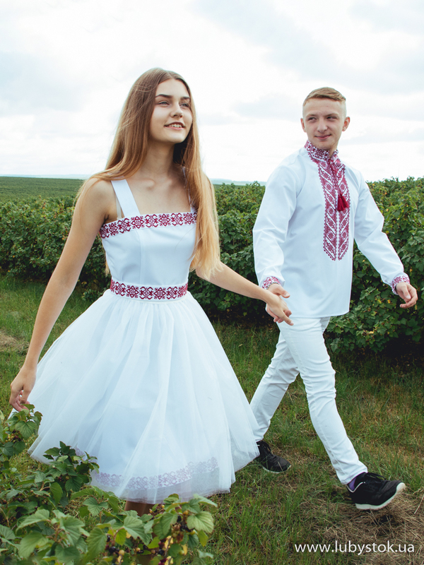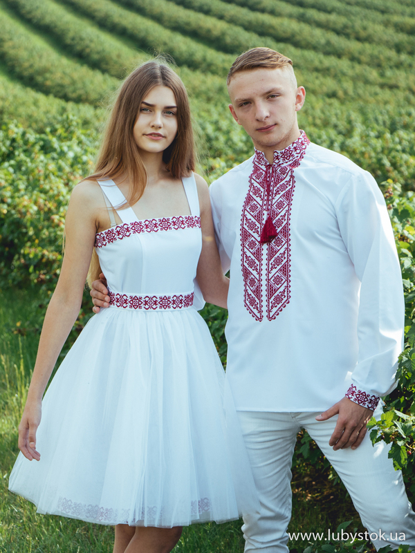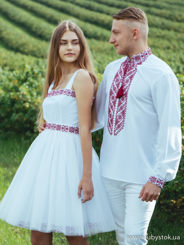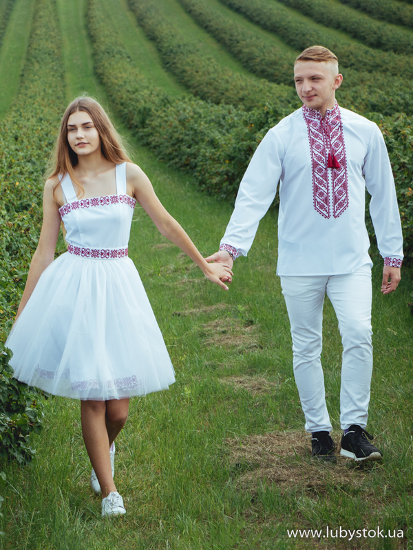 Комплект парних вишиванок P-001: чоловіча вишиванка S-066-02 та вишите плаття D-068-01.
